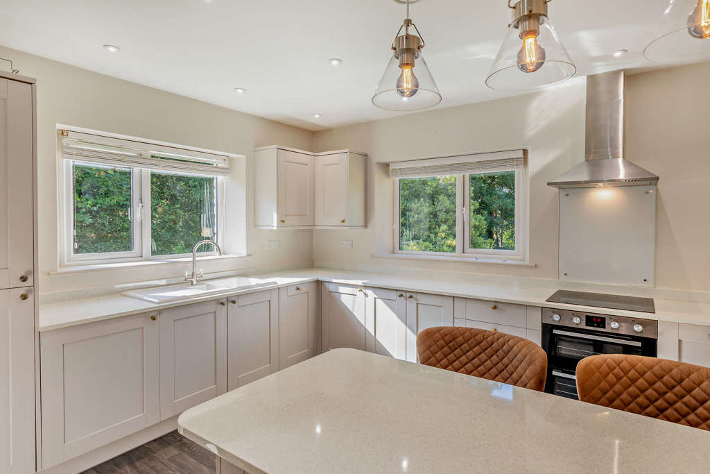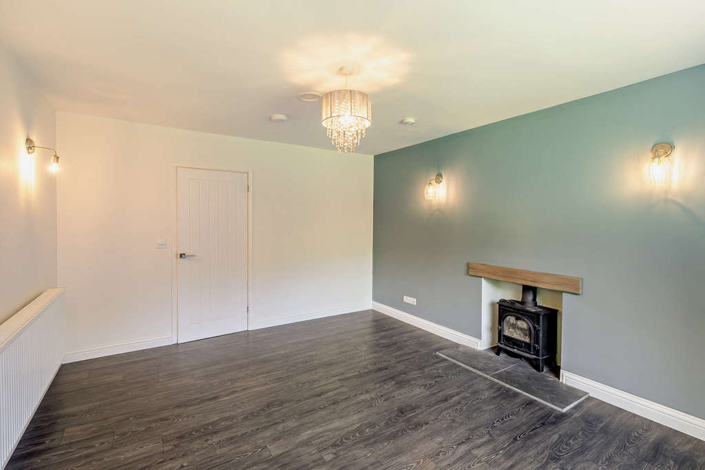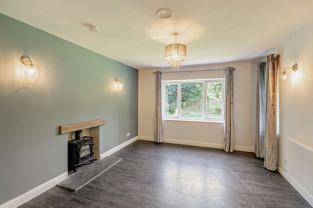 As you enter the property, the hallway leads to a modern kitchen with breakfast bar and adjoining pantry offering additional storage space. The kitchen benefits from double aspect views across the garden. There is a large, separate living room with a wood burning stove.