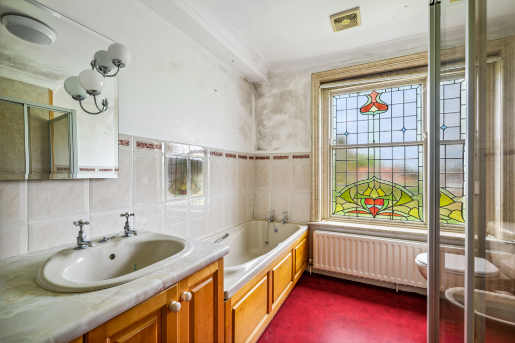 Single glazed stained glass sash window to side elevation, five piece suite comprising panelled bath, mid flush wc, bidet, shower cubicle, dual sinks in vanity unit, airing cupboard housing hot water tank, part tiled walls, extractor, heated towel rail, radiator.