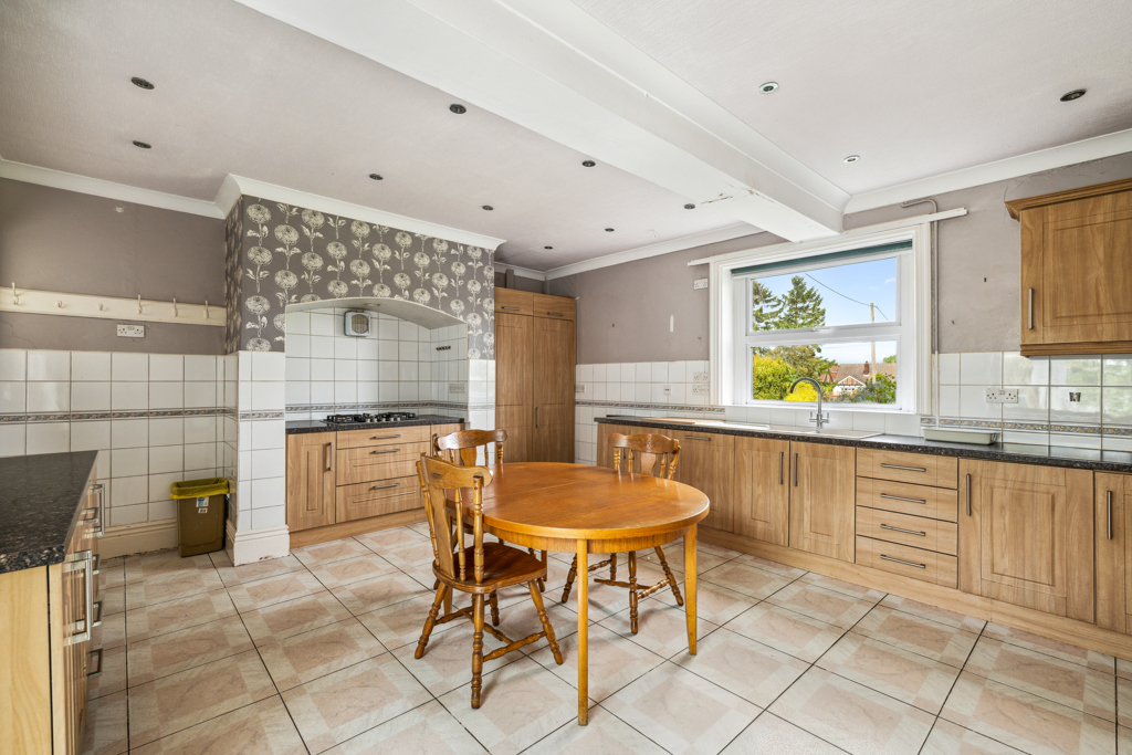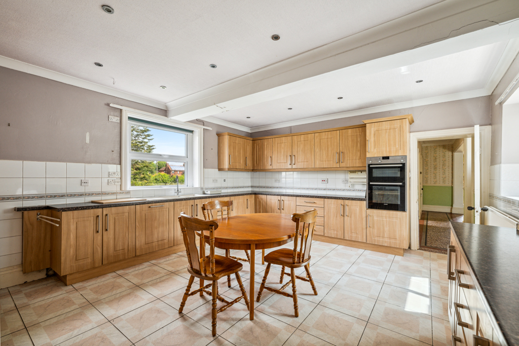 Double glazed casement windows to side elevation, fitted wall and base units with double sink and drainer, five ring gas hob with extractor, built-in Siemens oven, part tiled walls, built-in dishwasher, built-in fridge, double radiator, door to side elevation.