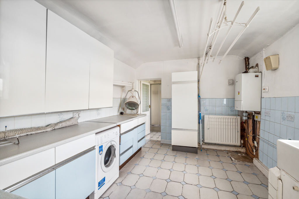 Double glazed casement window to rear elevation, fitted wall and base units with Belfast sink, space and plumbing for washing machine and tumble dryer, Worcester gas fired boiler, part tiled walls, loft access, door to;