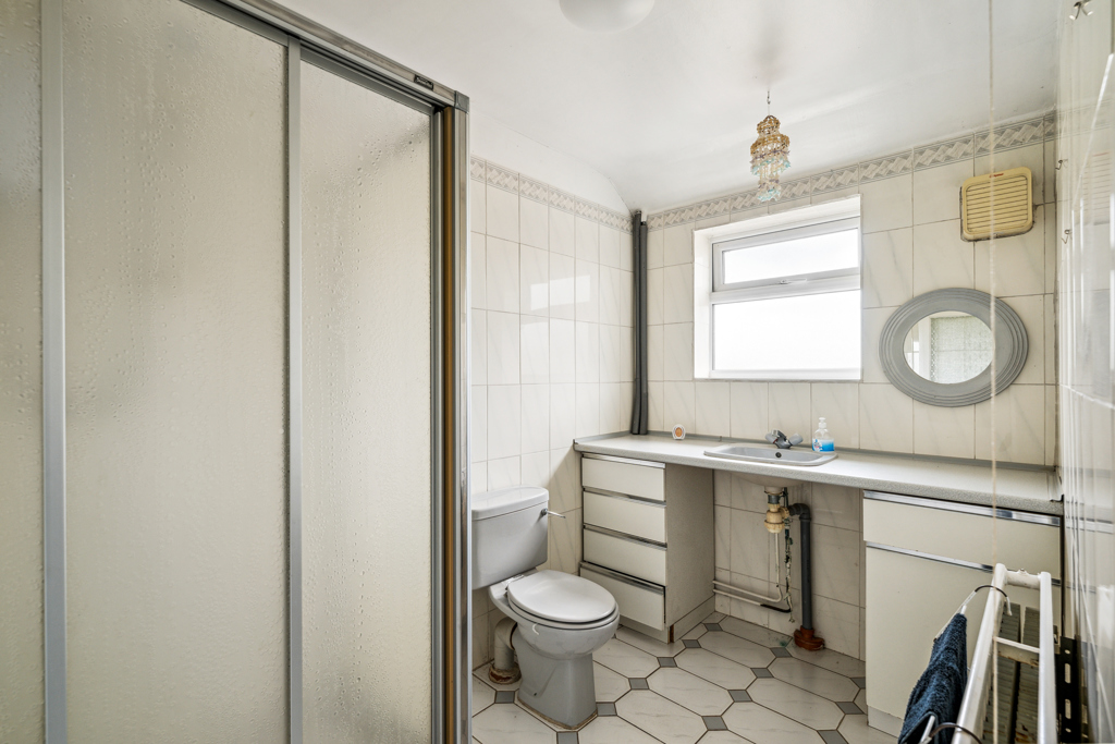Double glazed casement window to rear elevation, three-piece suite comprising shower cubicle, mid flush WC, wash basin in vanity unit, fully tiled walls, radiator, loft access.