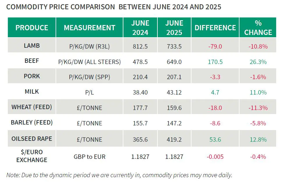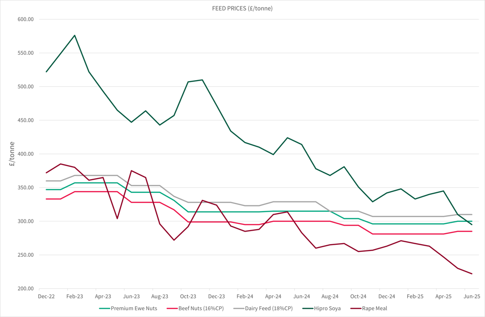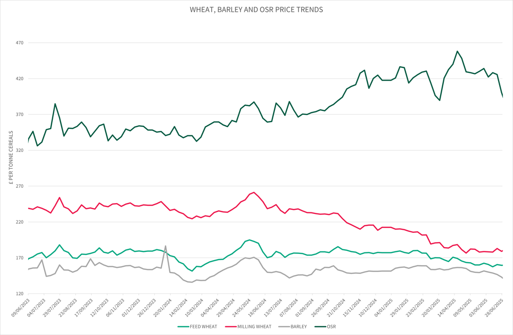 Cereal & Oilseed prices have continued to be under pressure throughout the second quarter of 2025, hitting a low of £157.50/t in mid-June for feed wheat. Despite a £37.50/t rally at the start of quarter two for OSR, it remained under pressure throughout the rest of quarter finishing at £400.7/t, a £31.8/t reduction from the start of the quarter.