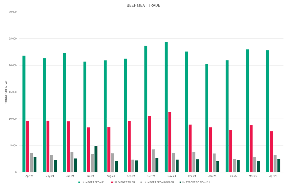 The UK remained a net importer for beef meat in April 2025 with a net balance of 15,986 tonnes.