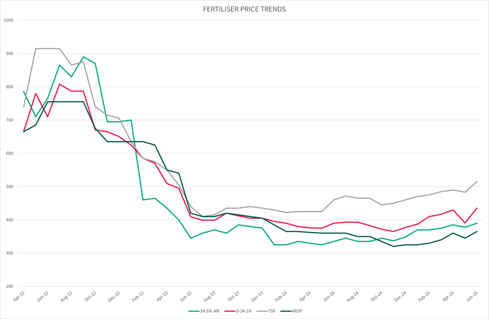 Fertiliser prices have experienced a gradual, but consistent increase in price throughout the second quarter of 2025, ending at £390/t for 34.5% AN.