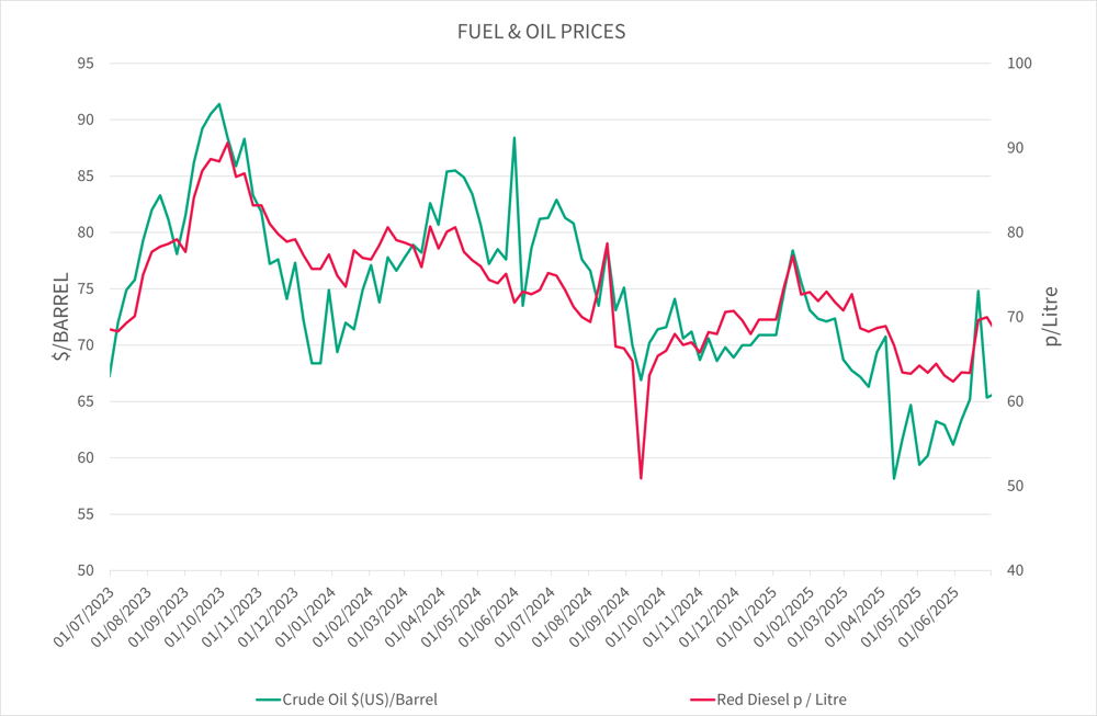 Crude Oil prices have decreased by $4.05/Barrel. Quarter two saw a high of $74.79/Barrel and a low of $58.16/Barrel. Red diesel saw an increase of 1.27pence/litre across the quarter ending at 69.97pence/litre.