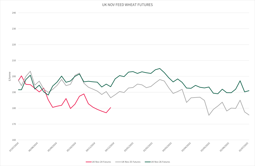 The November 2025 wheat futures spiked in mid-April, £186.90/t and the November 2026 futures peaked at £197.25/t in mid-June.
