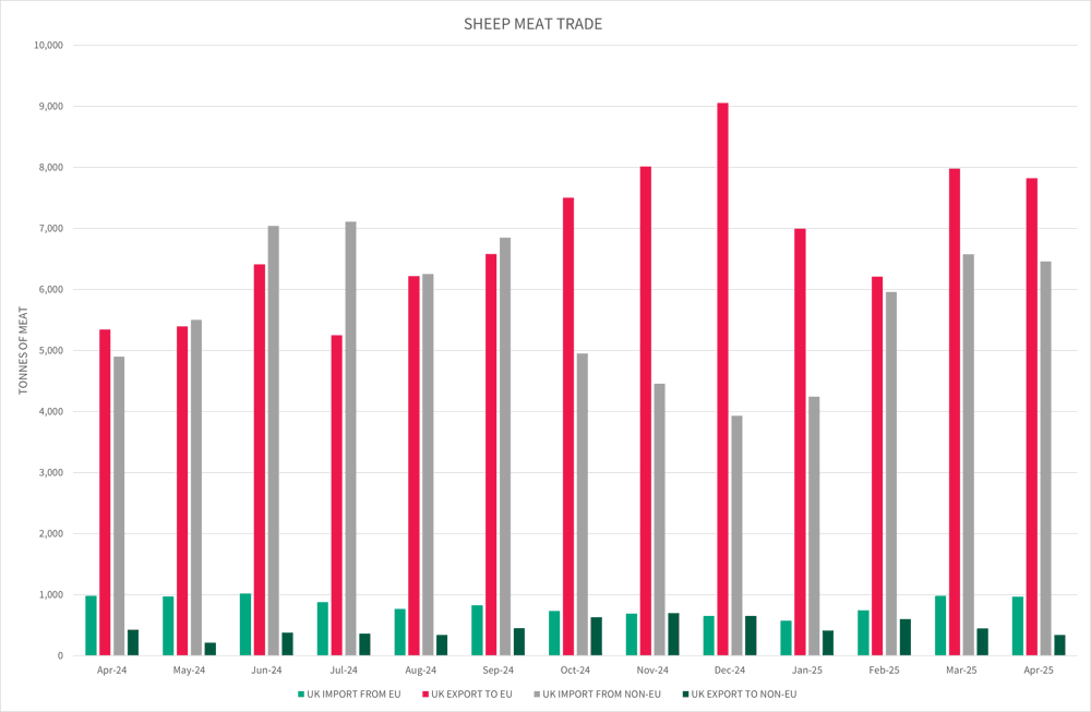 Overall, the UK has remained a net exporter for sheep meat, with the April 2025 trade balance at 741 tonnes.
